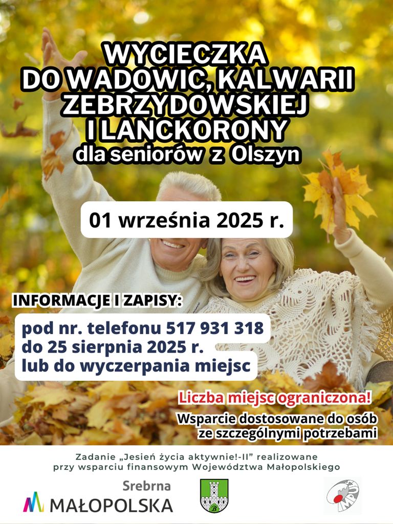 Zapraszamy seniorów (os. w wieku 60+) zamieszkałych w Olszynach na wycieczkę do Wadowic, Kalwarii Zebrzydowskiej i Lanckorony w dniu 01.09.2025 r.