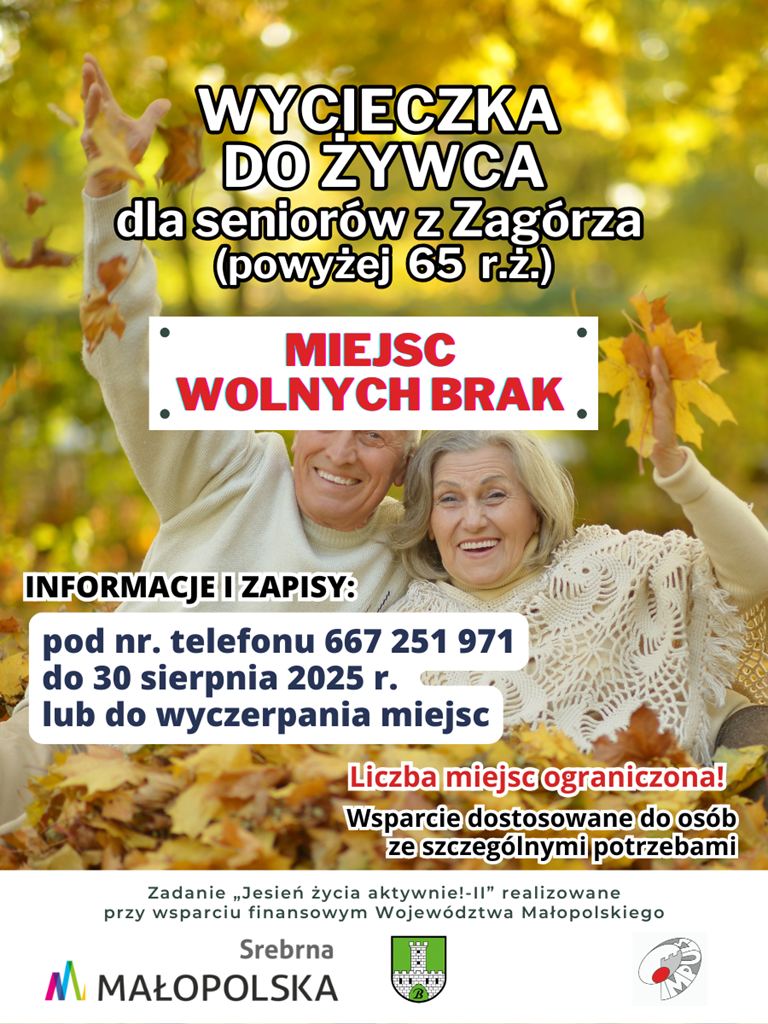 Zapraszamy seniorów (os. w wieku 65+) zamieszkałych w Zagórzu na wycieczkę do Żywca w dniu 02.09.2025 r.